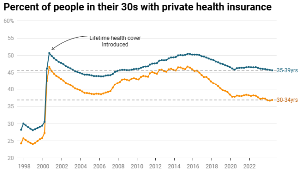 Even more damning on the worth of private health insurance as a product is that the percentage of Australians in their early 30s that have it is now as low as it has been since the introduction of the lifetime health cover: